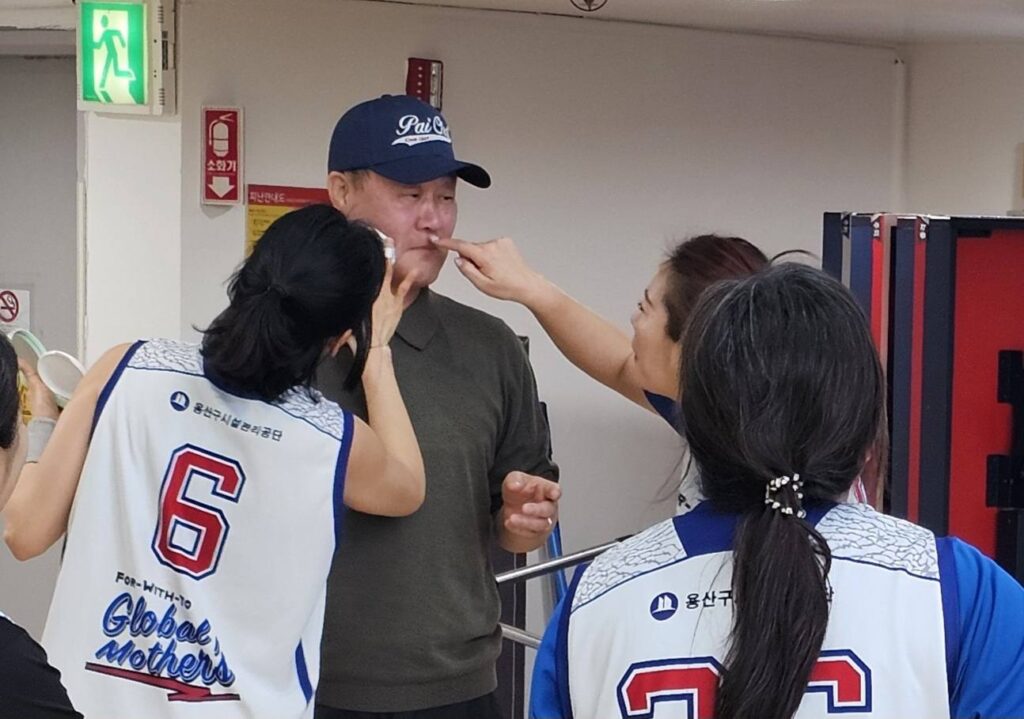 지난번 이웃집찰스로 예방주사 단단이 맞아선지 화면 발 잘 받으라고 선수들이 나서서 화장을 해 준다.